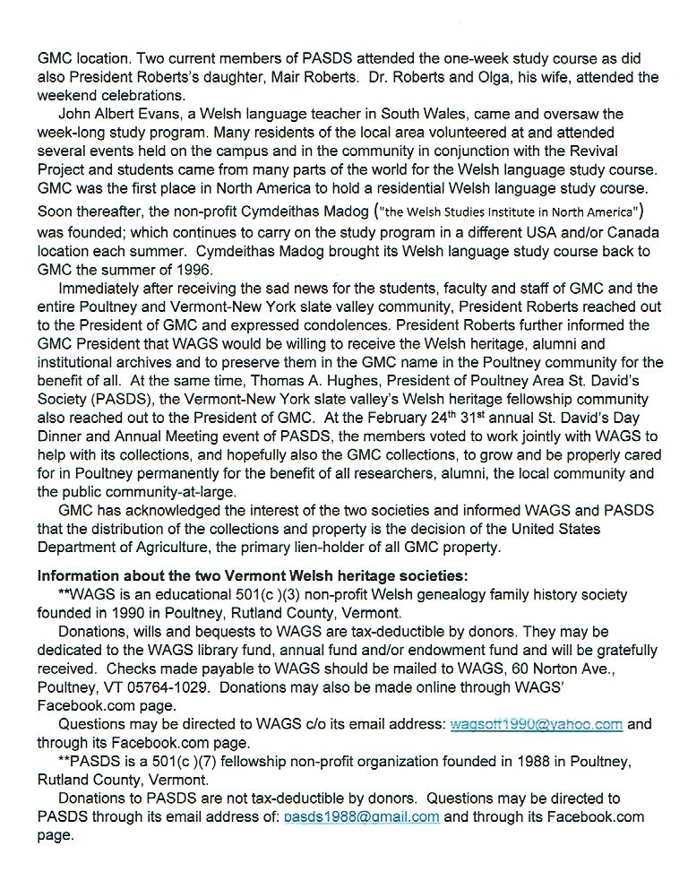 On May 27, 2019, an article about Green Mountain College’s Relationship with the Welsh Community was uploaded to the WAGS Facebook page. It is a public page and shareable. We hope it helps all to better understand why it is important to WAGS and the local Welsh heritage community that the college archives remain accessible in Poultney.